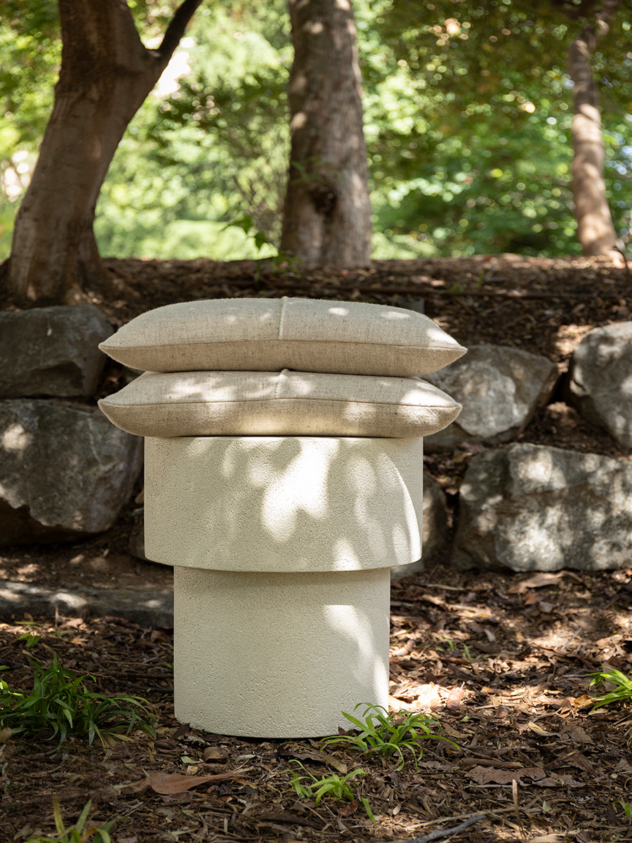El cojín icónico Sisteron de lana merina en su base es de color blanco grisáceo. Tiene un aspecto natural y suave debido al propio color y textura de la lana. Los perfiles de distintos tonos en tinte vegetal ofrecen la posibilidad de combinarlos en cualquier espacio.